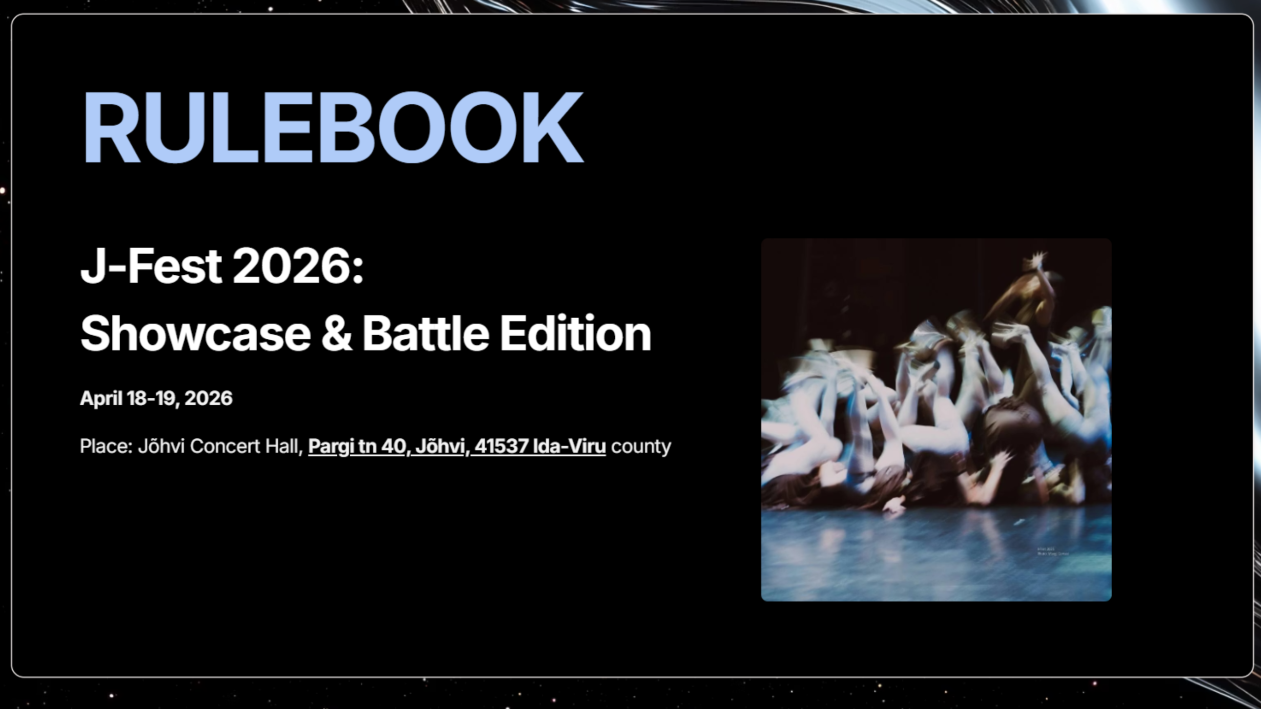 J-FEST MAIN J-FEST FLOW EDITION ABOUT US PARTNERS GALLERY RESULTS ET Hamburger Toggle Menu ALL INFO ABOUT J-FEST 2026: SHOWCASE & BATTLE EDITION REGISTRATION for SHOWCASE edition REGISTRATION for BATTLE "Me against the music" 1vs1 02/24/2026 at 1:52pm 02/23/2026 at 9:45pm 02/21/2026 at 2:32pm 02/19/2026 at 9:25pm 02/17/2026 at 9:27pm 02/15/2026 at 8:43pm